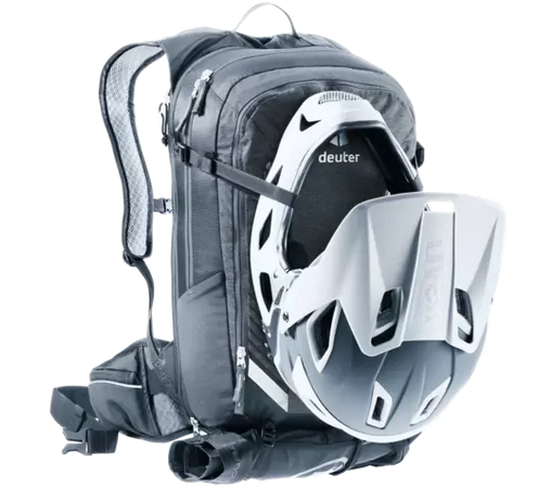 lassen sich Halbschalen- und Fullface-Helm. Für den Halb-schalenhelm gibt es vorne am Rucksack Befestigungs-Clips, während sich die seitlichen Kompressionsriemen zur Fixierung des Fullface-Helms eignen.