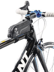 aufs Oberrohr geschnallt wird. So sind die kleinen Ausrüstungsgegenstände auch während