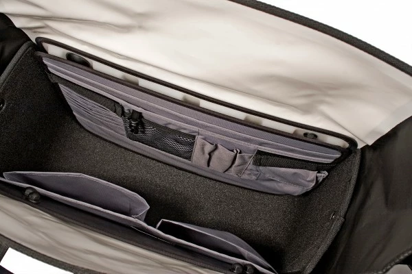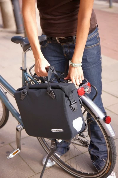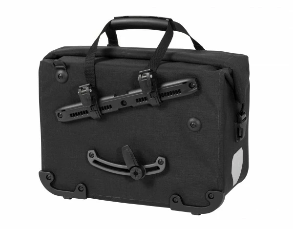 Die wasserdichte Fahrradaktentasche mit Rollverschluss kann rechts oder links am Gepäckträger angebracht werden und ist mit einem Handgriff schnell wieder eingehängt und abgenommen. Die Office-Bag bietet ausreichend Stauraum für zwei DIN A4 Ordner (Gr. L), Schreibzeug, Handy & Co. Zwei leuchtstarke Reflektoren aus 3M Scotchlite Reflexmaterial und das reflektierende Logo auf der Taschenvorderseite sorgen für gute Sichtbarkeit bei schlechten Lichtverhältnissen. Der Kantenschutz an der Taschenrückseite und stabile Abstellfüße sorgen für Schutz und sicheren Stand. Den nötigen Tragekomfort bietet der gepolsterte Schultergurt.