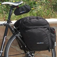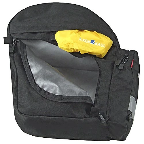 Die Taschen haben ein Top-Fach, ein separates, seitlich öffnendes Hauptfach und Außentaschen mit großen Reflektorstreifen. Wie bei hochwertigen Rucksäcken ist der Innenraum teilbar. Die Regenhaube ist im Extrafach der Vorderseite integriert, gut erreichbar und zum Reinigen und Trocknen leicht abknöpfbar.