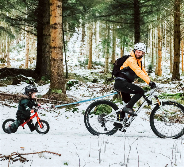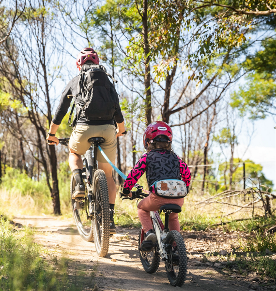 Set aus Kids Ride Shotgun MTB Tow Rope Abschleppseil und wasserfester Reißverschluss-Hüfttasche zur Aufbewahrung.