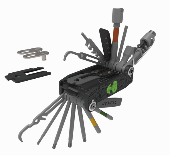 Kettennieter*, Kettenfixierhaken, Kettenschlosswerkzeug, Reifenheber**, Messer (mit Feststellfunktion & Schutzcover), Presta-Ventilwerkzeug, Speichenhalter, Bremsbelagspreizer, Niet-Amboss für Campagnolo, Hollow Pin Ketten, Nietstiftbrecher, Fach für Kettenschloss, Zweiteiliges Design, Verlängerter Hebel, Werkzeugvorspannung einstellbar