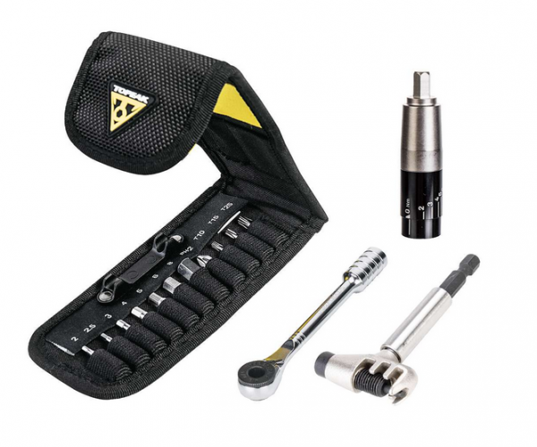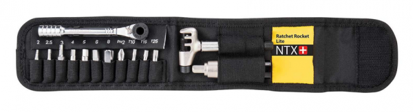 Die Ratchet Rocket Lite NTX+ bietet unterwegs alles, was zur Reparatur der meisten Defekte benötigt wird. Mit Feinzahnmechanismus, Präzisions- Daumenhebel zum Umschalten der Laufrichtung und Nano TorqBit zum exakten Einstellen des korrekten Drehmomentes. Inklusive magnetischem Bithalter, Werkzeugbits (2 / 2,5 / 3 / 4 / 5 / 6 / 8 mm Inbus®, T10 / T15 / T25 Torx®, #2 Phillips), zwei Reifenhebern sowie einer Tasche für sicheren Transport und einfache Organisation. Auch selbstklebende Flicken finden in einem separaten Fach ihren Platz.